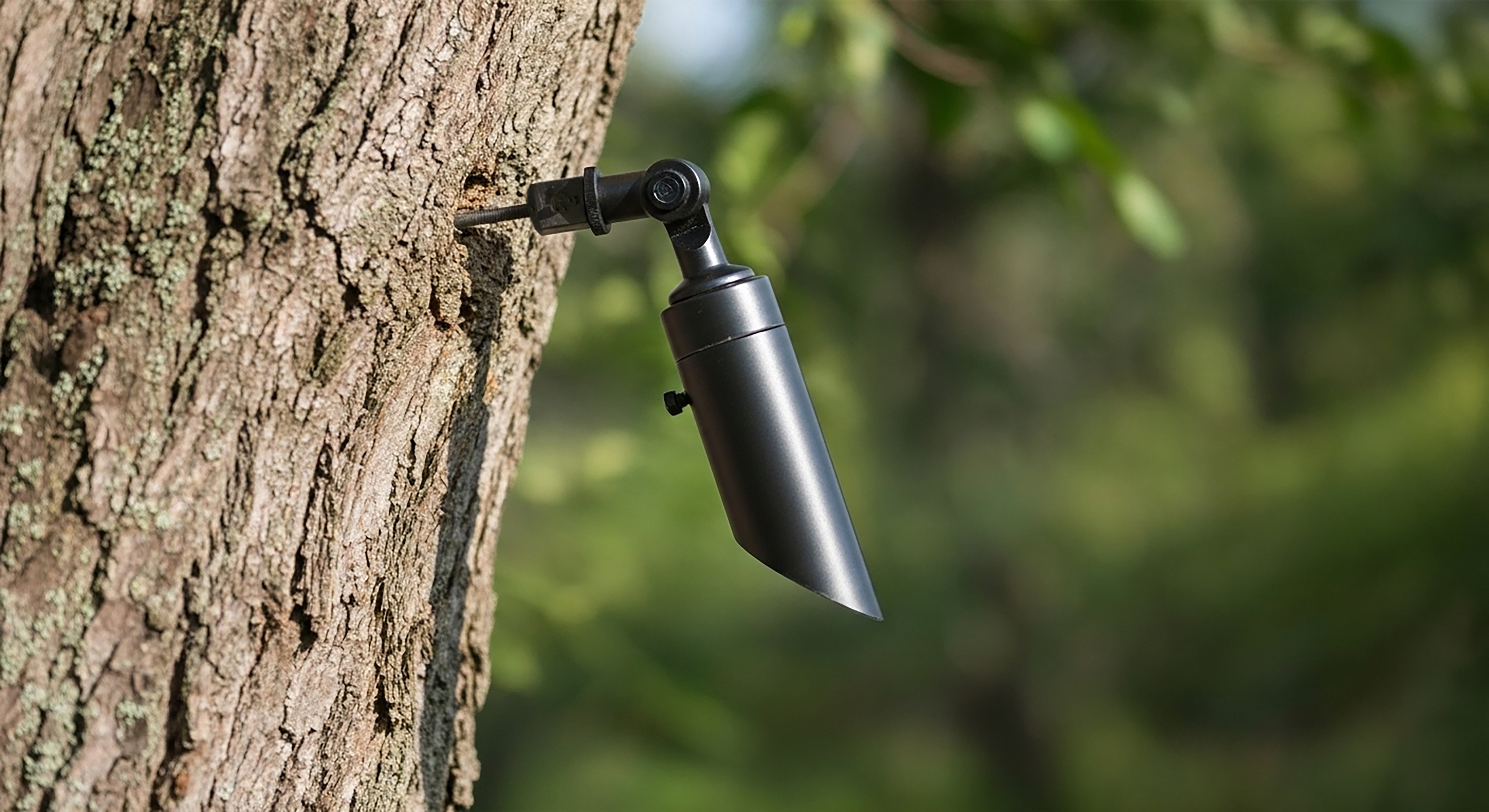 The Mountie is a reliable, professional-grade tree-mount bracket engineered to create a natural downlighting effect from trees—adding depth, texture, and ambiance to your outdoor space. Its single-point, tree-friendly design allows for healthy long-term growth without harming the tree, while installation takes only minutes with a standard drill and nut driver bit. Available in durable bronze or black powder-coat finishes, the Mountie blends effortlessly with the trunk for a clean, discreet appearance.
